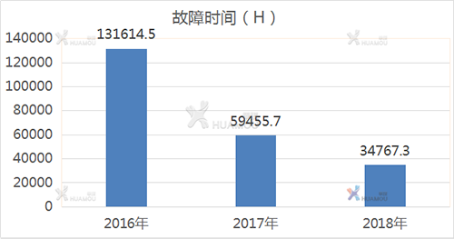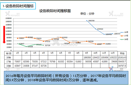 2)2016年每月设备平均故障时间(所有设备)13万分钟,2017年设备平均故障时间5.9万分钟,2018年设备平均故障时间3万分钟,顺利获得2年设备管理改善降低设备故障时间77%。