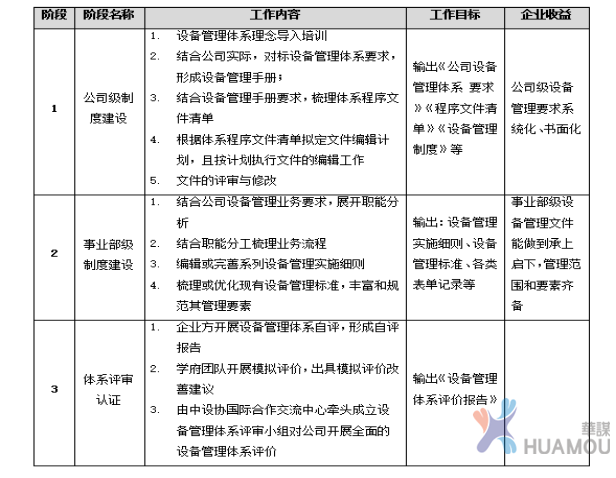 2018年7月份,项目启动。经过全面系统的企业调研,项目组与客户方确定了项目目的:强化基础管理,提高员工对设备维护保养的驾驭能力,提升设备管理体系水平,提升企业核心竞争力。项目实施推进内容,包括五大模块: